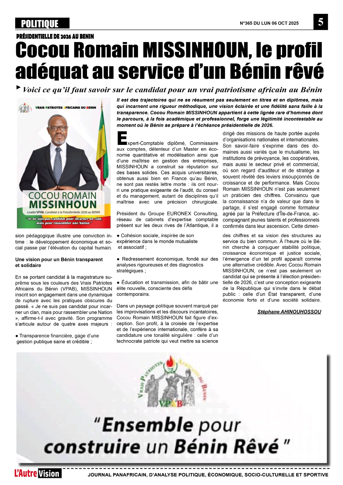 Cocou Romain MISSINHOUN est une figure marquante de la finance et de l’économie au Bénin et en France. Son parcours académique l’a conduit à obtenir un Diplôme d’Expertise Comptable (DEC), un Master en Économie quantitative et modélisation, ainsi qu’une Maîtrise en Gestion des Entreprises. Ces acquis lui ont permis de bâtir une carrière fondée sur la rigueur, la méthode et une compréhension profonde des enjeux économiques et organisationnels, du niveau micro jusqu’aux grandes orientations macroéconomiques.